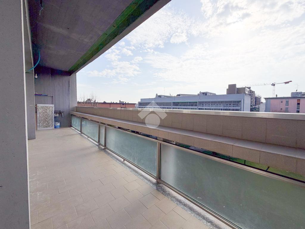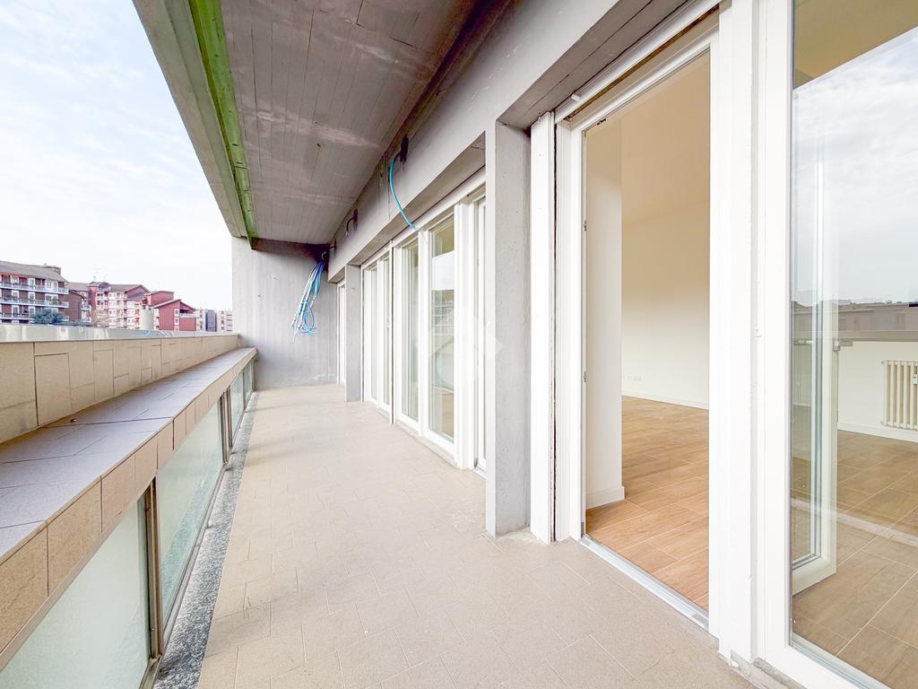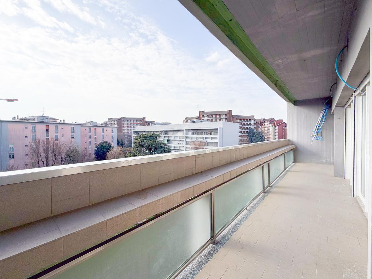 Il balcone ampio e vivibile collega il soggiorno e le camere, offrendo continuità tra gli ambienti interni e lo spazio esterno.